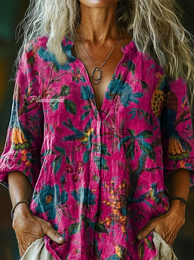 Women's Vintage Folk Floral Art Print Casual Cotton Linen Shirt