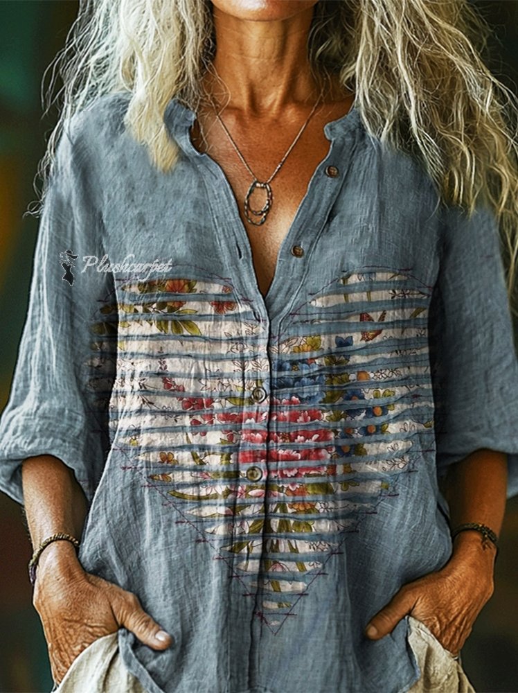 Women's Vintage Heart Floral Art Print Casual Cotton and Linen Shirt
