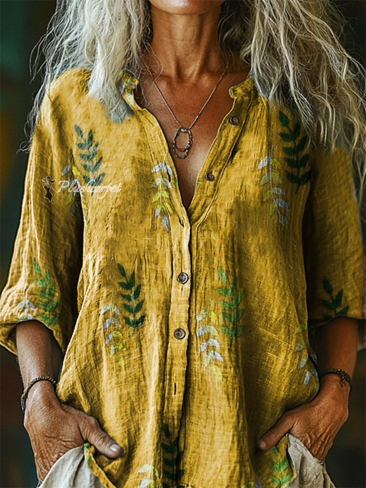 Women's Vintage Leaf Art Print Casual Cotton Linen Shirt