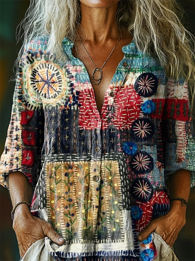 Women's Vintage Patchwork Pattern Art Print Casual Cotton Linen Shirt