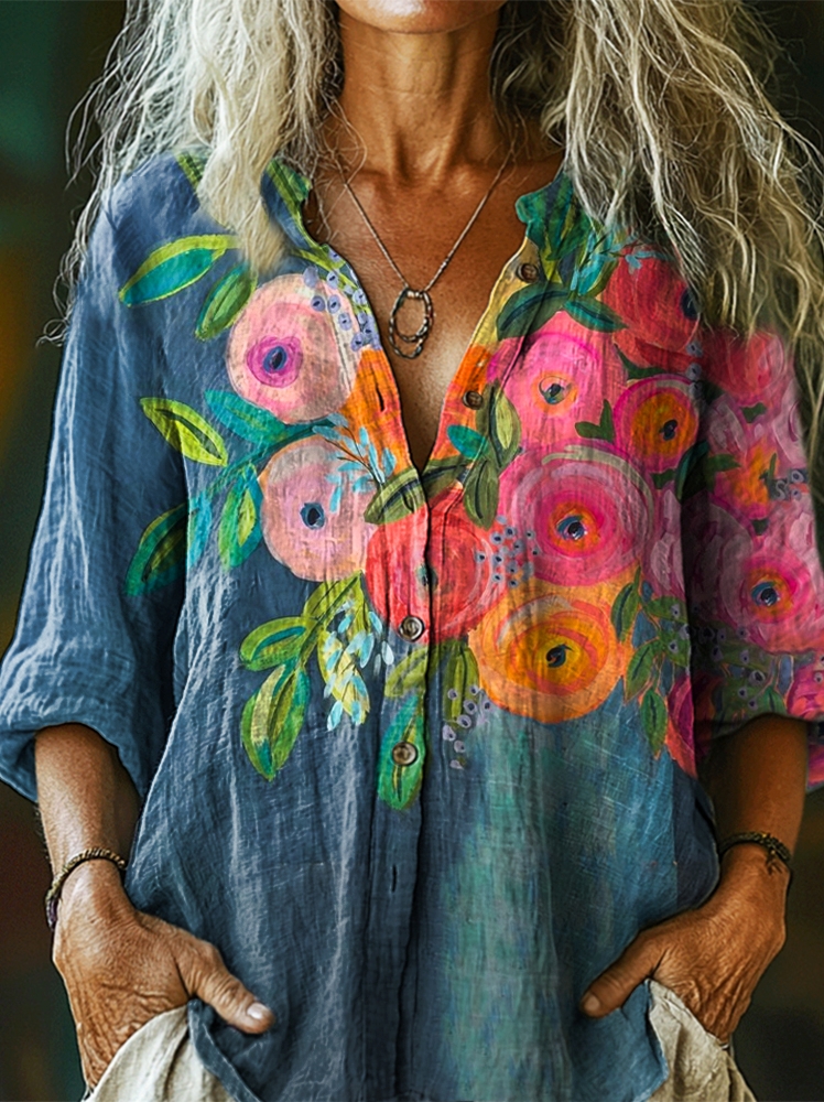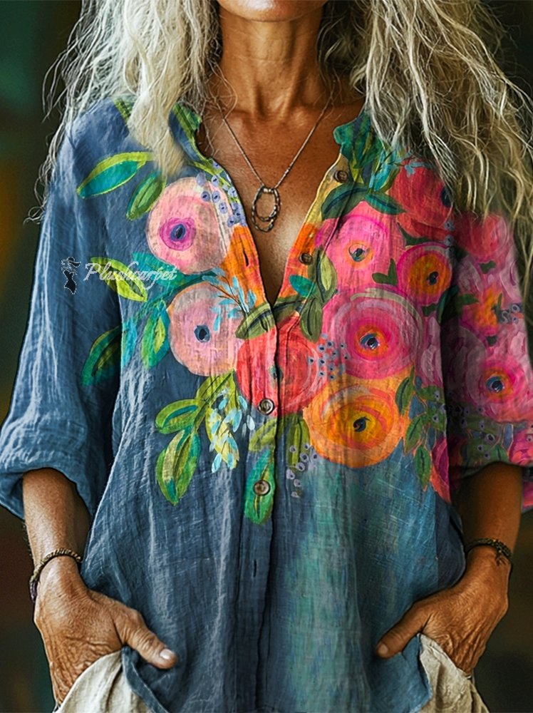 Women's Watercolor Floral Art Print Casual Cotton Linen Shirt